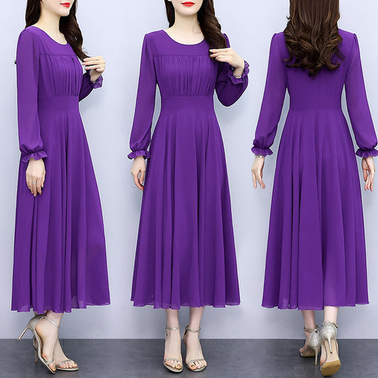 Organ Pleat Solid Color Wide Hem Slim Fit Slimming Long Sleeves Dress