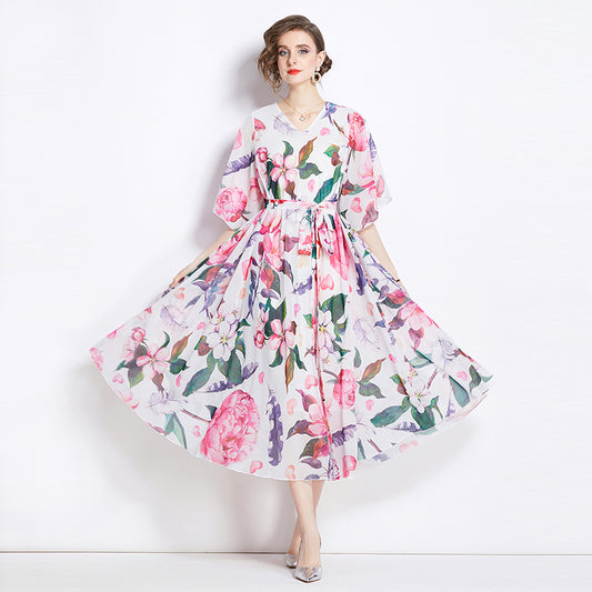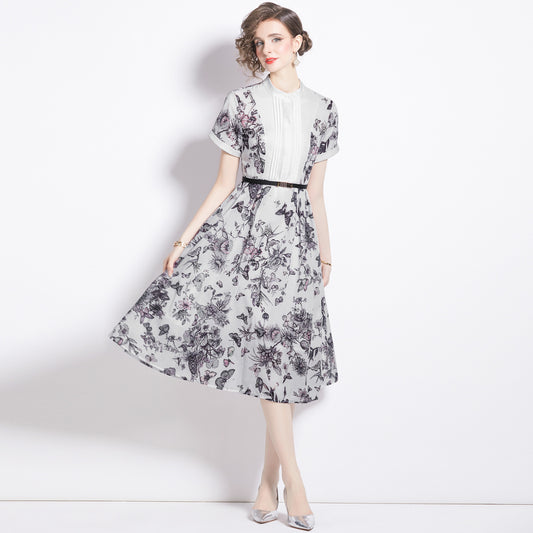 Printed Stripes Stitching Ink Printing And Dyeing Large Swing Dress